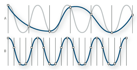 Ce qui est intéressant, c'est cette notion de presque-partout qui permet d'approximer une courbe continue avec des valeurs discrètes reliées par des courbes mathématiques. Mais le résultat ne sera pas identique, si par exemple, mon son d'origine contient une fréquence F très élevée et que je ne peux échantillonner à une fréquence supérieure à la moitié de F. A la restitution, soit j'aurais une courbe reconstituée qui contiendra des recouvrements (des fréquences parasites) soit la fréquence F n'existera plus.